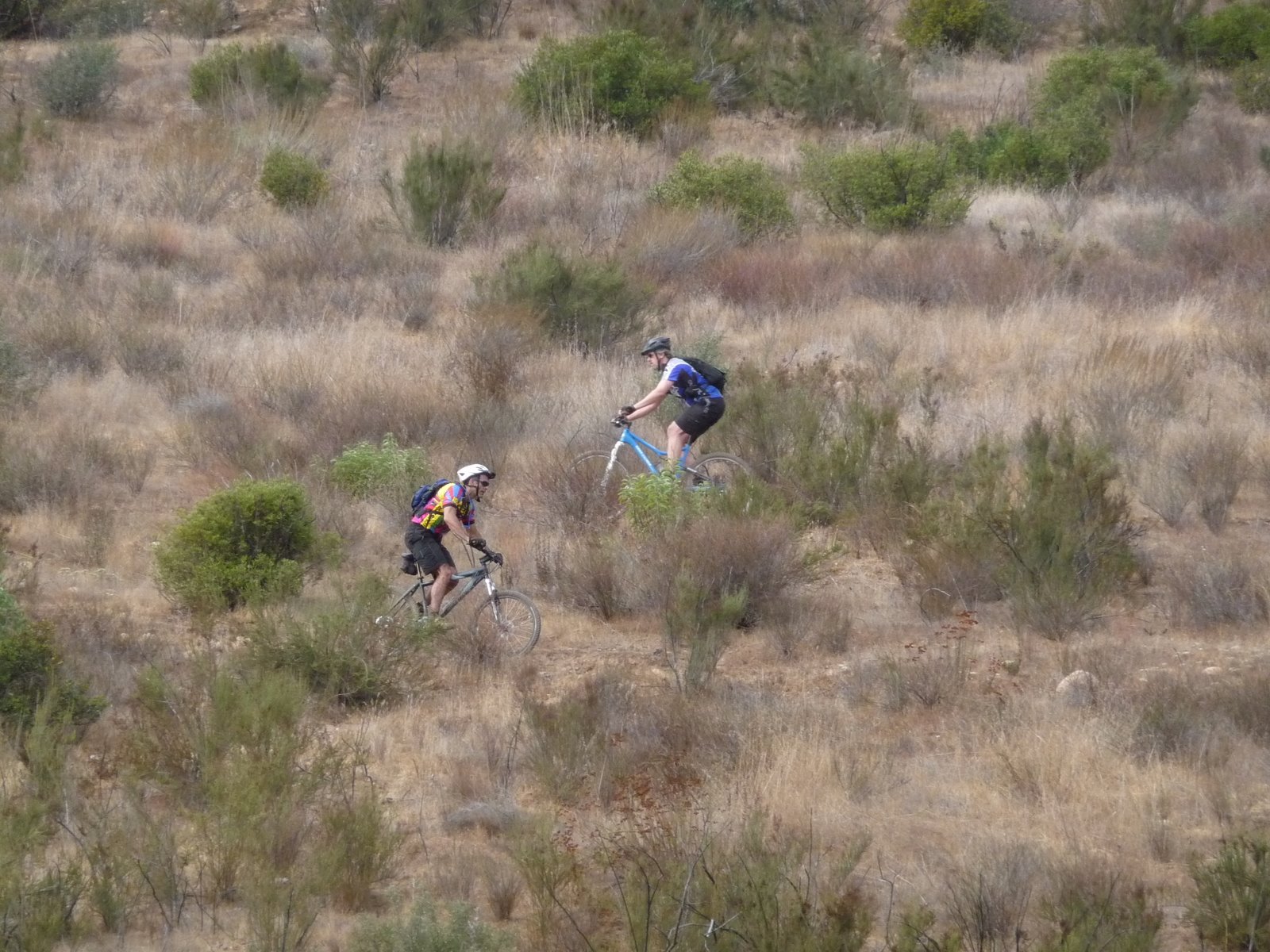 We started off the ride by stopping and chatting with someone who was just finishing his ride. After lamenting the loss of the secret status the trails had apparently held for the past 20 years, he gave us a quick idea of the layout of the park and a direction to head, even drawing a map in the dirt. Following what I remembered of his map, we zipped along on a fire road until spotting what I assumed was the singletrack he had mentioned. We veered left, grabbing the singletrack and immediately had to pull over because other cyclists were coming in the opposite direction. After they passed, we continued on our way, zipping through some really nice singletrack, over a bridge, through some gullies, and finally being redeposited onto the fire road we had started on, just further west. We rode the fire road down the hill until spotting another singletrack. I slowed to make sure everyone was still with me, then jetted down the singletrack. It was fun and fast, but not terribly challenging or scenic.Along the way I got to watch someone recover, somewhat gracefully, from an endo. We both made it to a wash at the same moment. The wash had a nearly vertical slope requiring attention. Unfortunately, the other rider looked up, expecting to see me descending, but I stopped before entering. As usual, those moments in Mountain Biking that requires our attention and don't get it, are the moments where we discover more slapstick. Fortunately, the rider was unharmed; but we came to learn that this group saw the posting and could have come on the ride with us but chose to ride on their own.